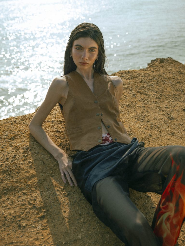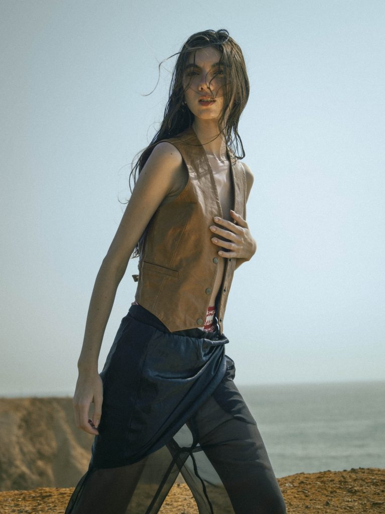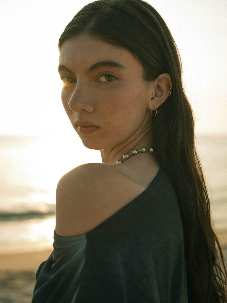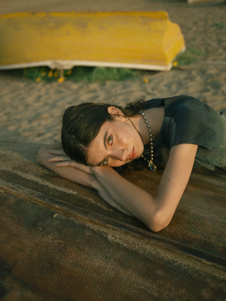 Olivia se mueve en ese tiempo que no apura. Camina, observa, se deja envolver por el paisaje sin buscar nada. Las prendas, ligeras y abiertas, acompañan ese movimiento sin esfuerzo, como si también respiraran con el viento.