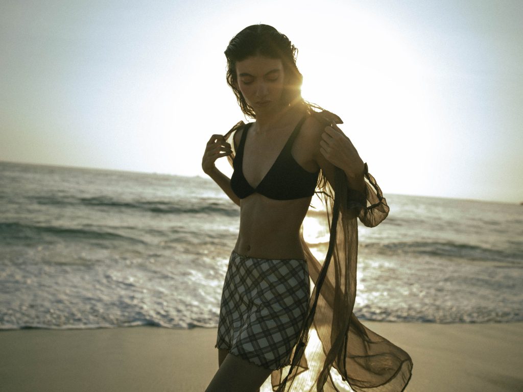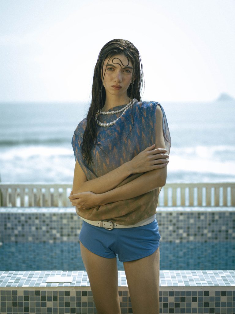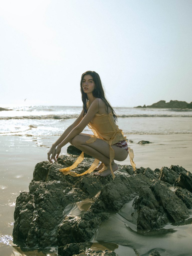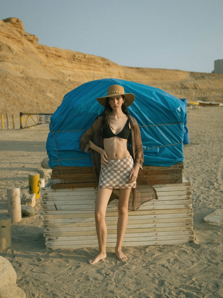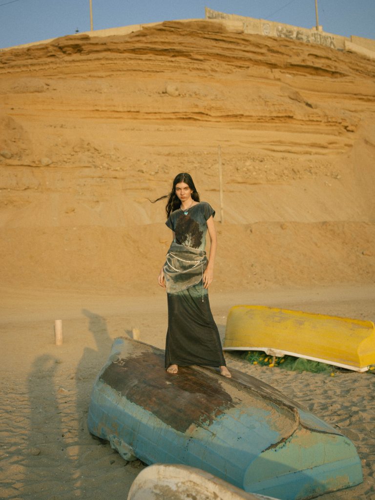 Olivia se mueve en ese tiempo que no apura. Camina, observa, se deja envolver por el paisaje sin buscar nada. Las prendas, ligeras y abiertas, acompañan ese movimiento sin esfuerzo, como si también respiraran con el viento.
