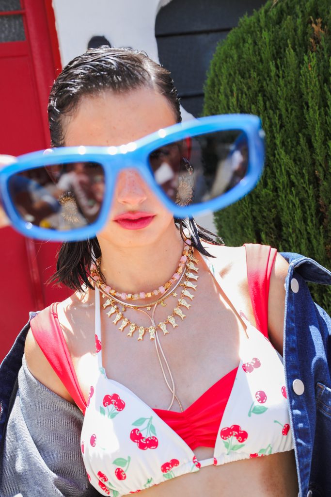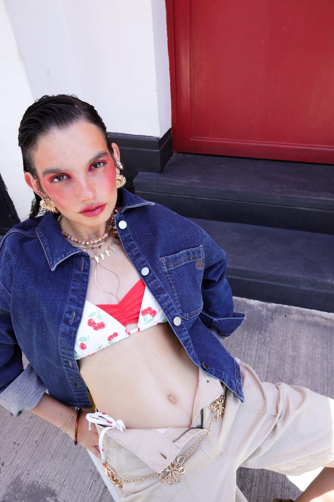Chamarra de mezclilla, bermudas y sandalias de tacón: Timberland. Traje de baño con cerezas: Aerie. Aretes, collares y cinturón: Stradivarius. Lentes de sol: Arnette.
