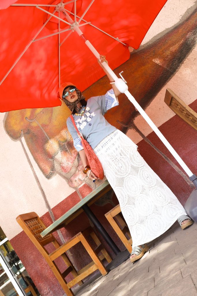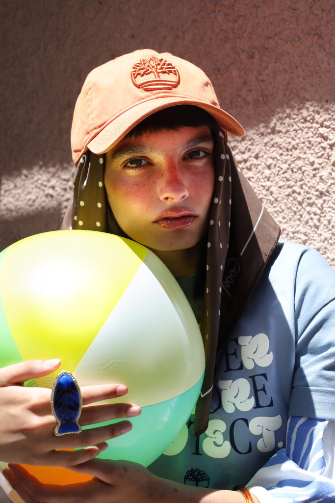 Playera, gorra y sandalias: Timberland. Mascada y playera con barbas: Stradivarius. Lentes de sol: Arnette. Vestido tejido: Desigual. Anillo de pez: Bimba y Lola.