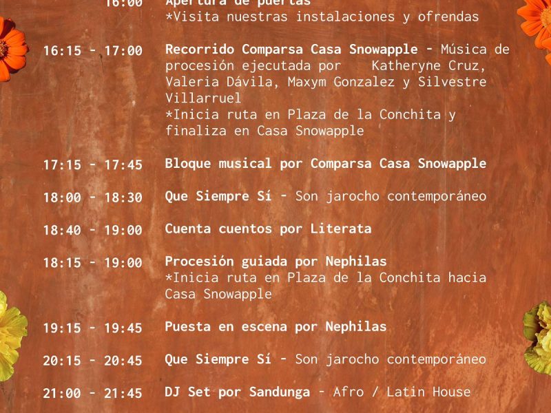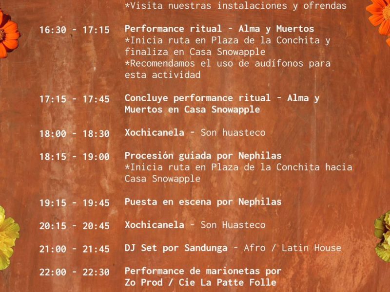 El programa reúne una vibrante selección de artistas y colectivos que reinterpretan la tradición desde distintas disciplinas. Entre ellos destacan Mexicana Hermosa (mariachi), Que Siempre Sí (son jarocho), Xochicanela (son huasteco), Alina Kiliwa (rotulista y artista del lettering), Dora Bartiloti (artista multimedia), Nephilas (movimiento performático), Rosa Landabur (artista escénica), Sandunga (música electrónica), Zo Prod y Literata (libros y poesía), junto con otrxs invitadxs por anunciar.