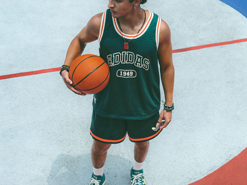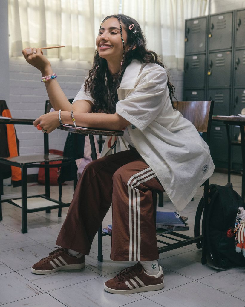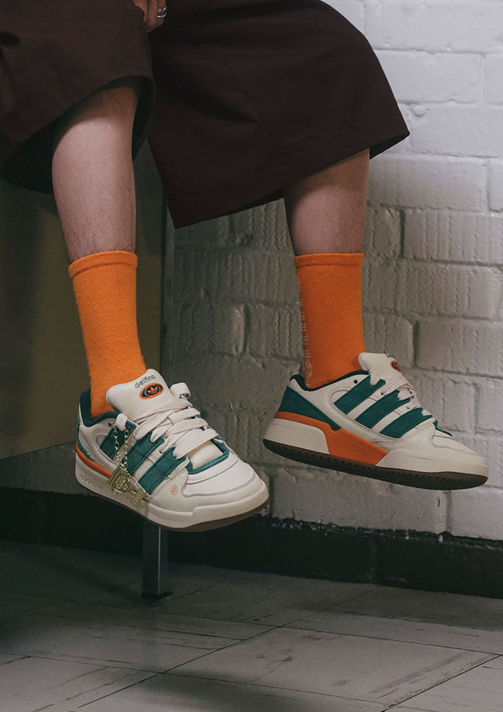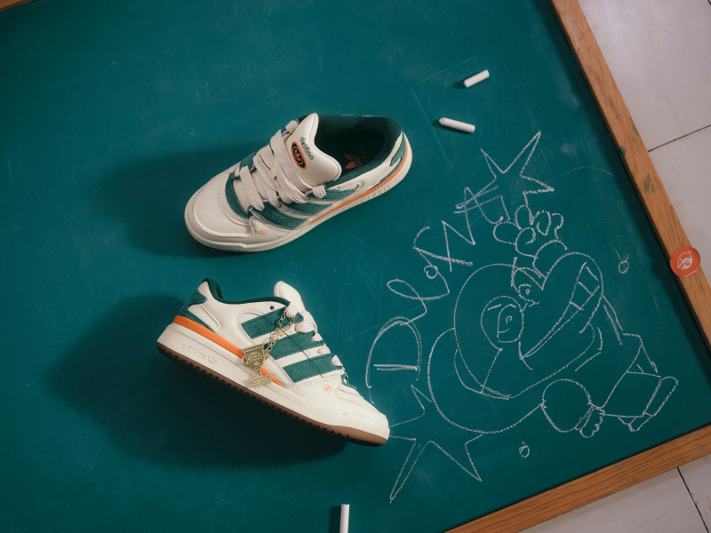 Las siluetas Forum 00s, Jabbar y Jabbar Low se visten con marrón y verde profundo, colores que evocan directamente las aulas de secundaria. El sello de Delfino aparece en el talón, un gesto gráfico que convierte a cada par en un manifiesto visual. En apparel, las prendas retoman el espíritu utilitario de la vida escolar y lo llevan a un terreno contemporáneo, pensado para la calle y para quienes ven la moda como forma de expresión personal.