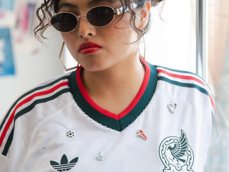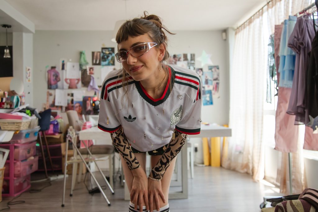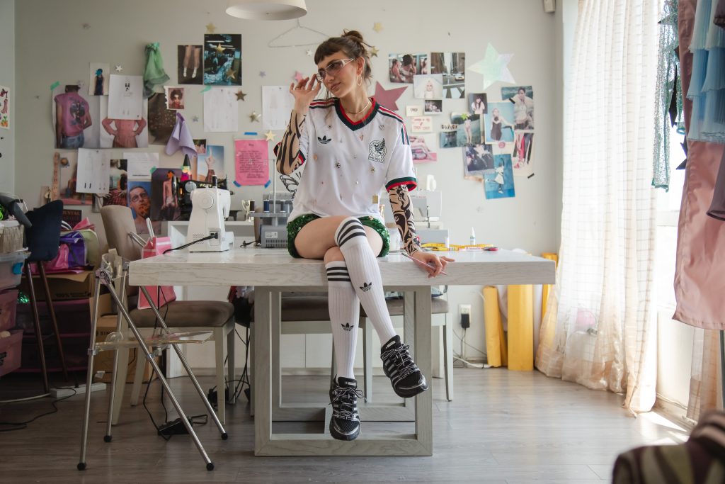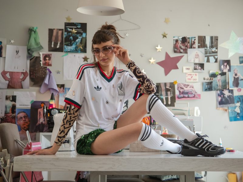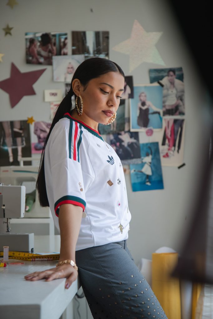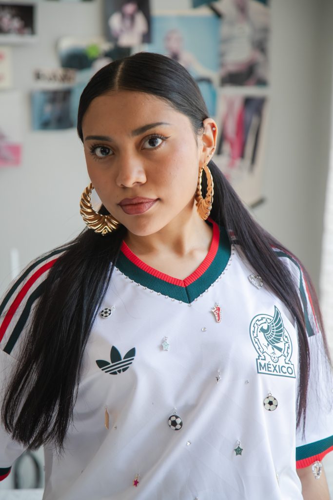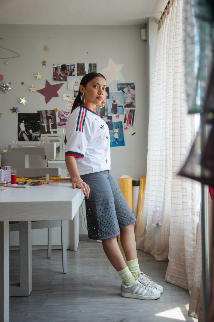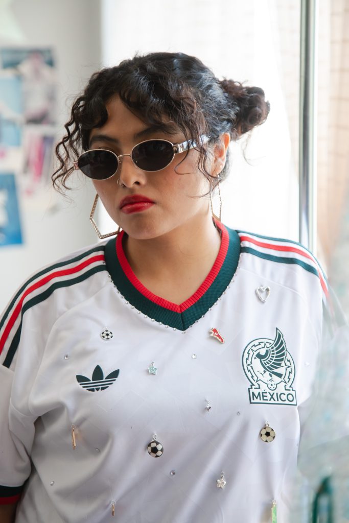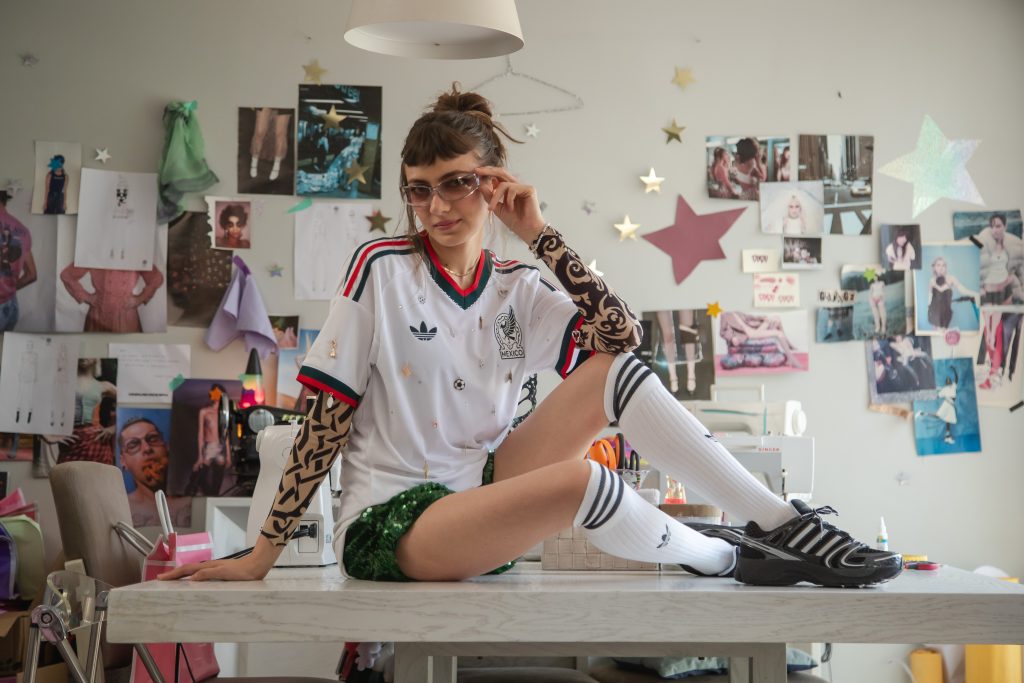 Lentes muy Y2K, mangas de tatuajes y un mini short de lentejuelas son un combo retro que va ideal con el jersey de la Selección Nacional de México. A esto le sumamos unas calcetas muy largas y un par Adistar para contrastar esa vibra glam al máximo.