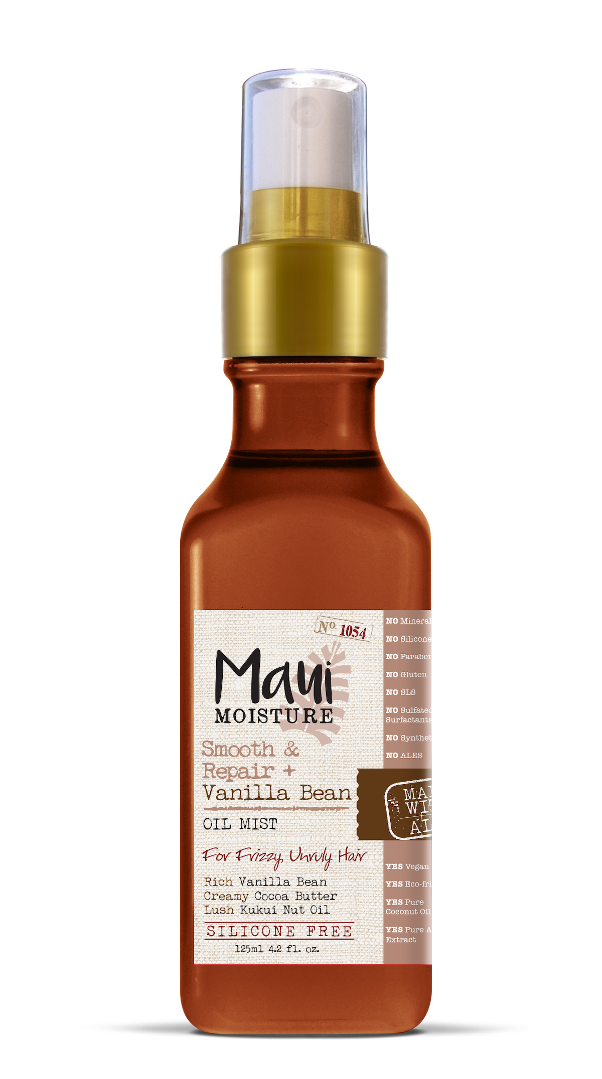 Smooth & Repair Vanilla Bean Extract Oil Mist de Maui. Aplica en tus manos y calienta un poco el producto, después esparce por el pelo de medias a puntas antes de hacer la coleta. Aplica un extra en los mechones al frente y con lo que sobre en tus manos pasa por la cabeza.