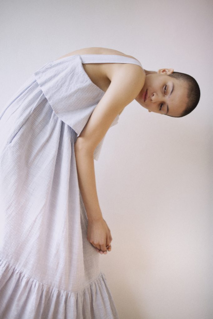 En cuanto al génesis de las prendas, las fibras naturales son fundamentales y las únicas que se utilizan para elaborarlas. El algodón y el lino son constantemente estudiados por la diseñadora y su equipo para que funjan como los únicos protagonistas de las telas. Los teñidos en estas fibras son de muy baja saturación, por lo que encontrarás piezas monocromáticas; unas que aprovechan los tonos naturales del algodón y el lino, y otras con sutiles urdimbres de rayas sobre la tela.