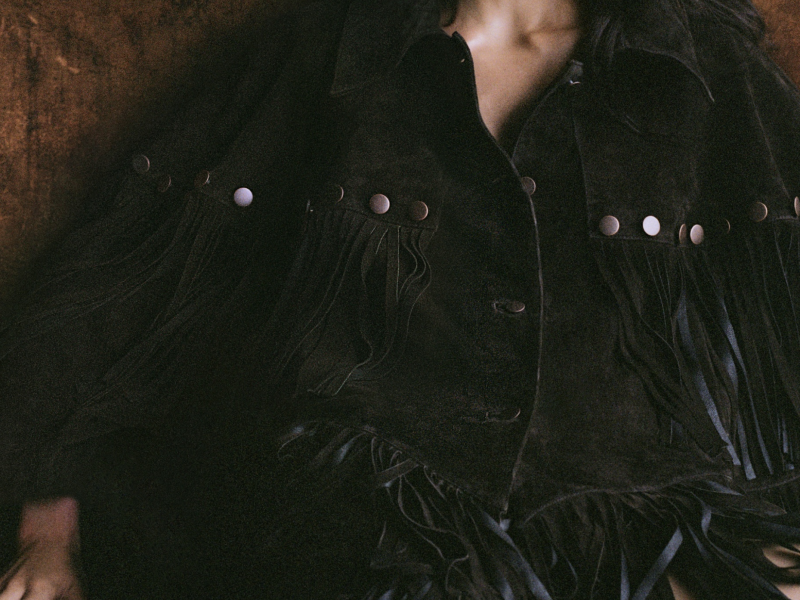 Este espíritu auténtico se reinventa con un giro femenino y actual: la combinación de una chamarra de gamuza con flecos y una falda asimétrica definen un look urbano y con actitud.