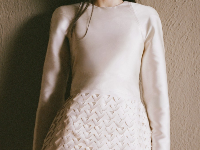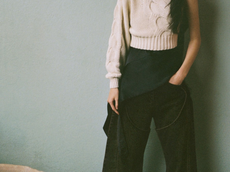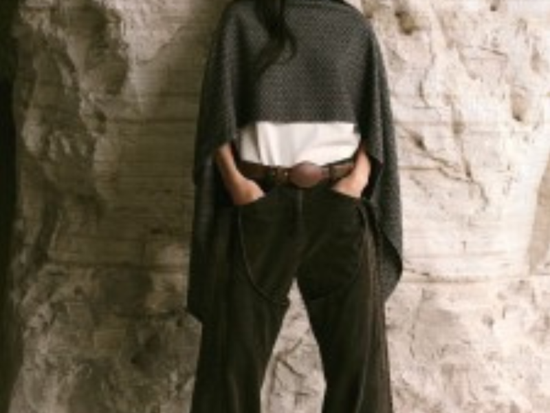 Mientras tanto, los looks nocturnos aportan sensualidad, destaca un vestido negro de chiffon con espalda al descubierto y un top halter asimétrico, complementados con una minifalda drapeada y una tela con caída que aterriza en el suelo. Por el contrario, sudaderas y t-shirts con logo bordado, junto con un suéter de punto grueso color crema y de un solo hombro, integran el lado casual de la propuesta.