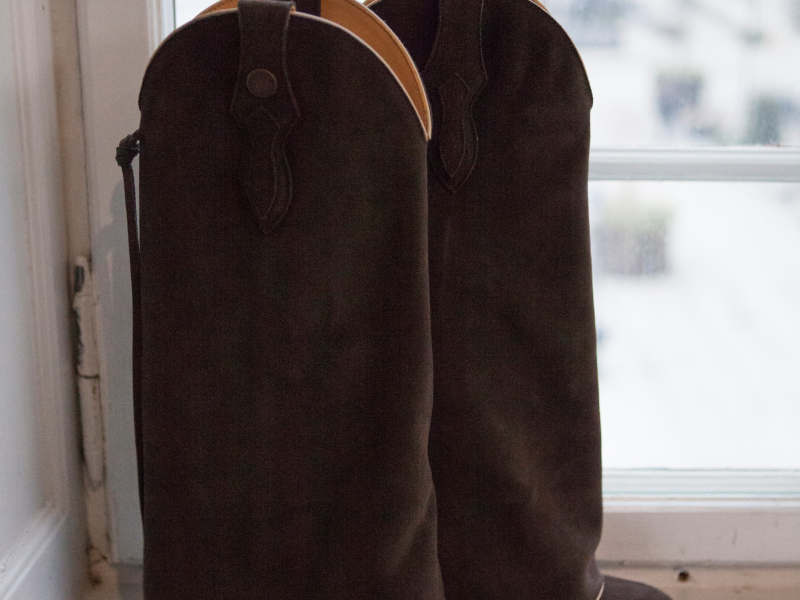 Las botas vaqueras de gazuma en color café y de tacón de madera son su distinción propia, pensadas para brindarle seguridad, fuerza y poder a cada mujer con cada paso, y un sombrero de ala ancha y cinturón que adicionan presencia sin esfuerzo.