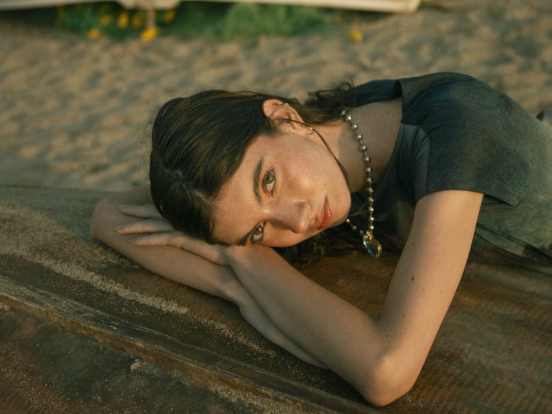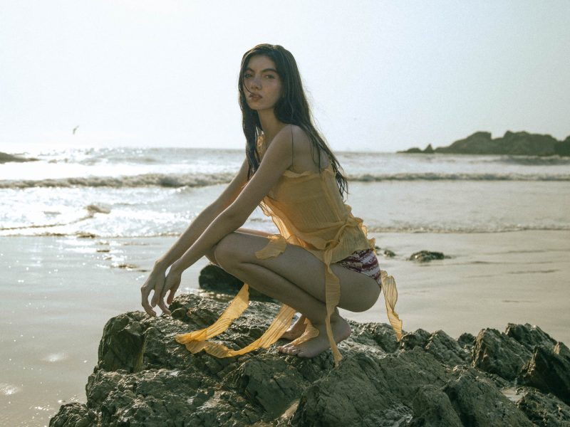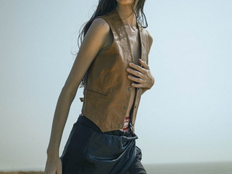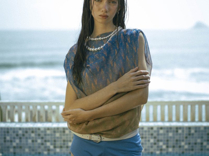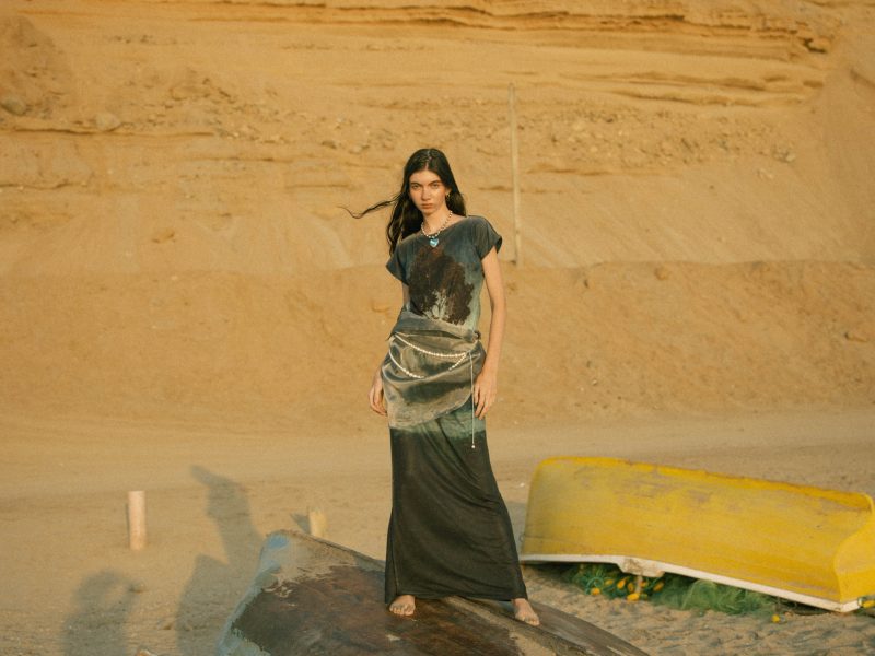 Olivia se mueve en ese tiempo que no apura. Camina, observa, se deja envolver por el paisaje sin buscar nada. Las prendas, ligeras y abiertas, acompañan ese movimiento sin esfuerzo, como si también respiraran con el viento.